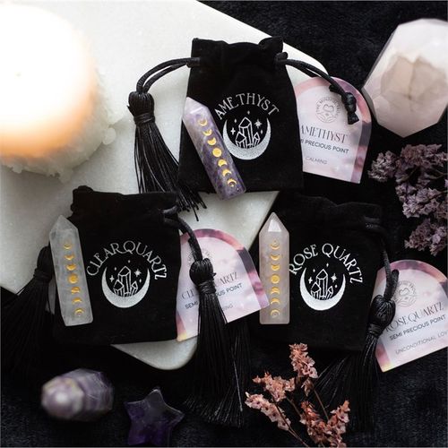 This beautiful rose quartz crystal point is perfect in size for travel altars, desk decor or taking on the go for extra protection. Features a gold-tone moon phase engraving and comes with a matching drawstring bag for storage and safe-keeping. Product Dimensions: H5cm x W1.2cm x D1.1cm Packaged Dimensions: H8cm x W5.5cm x D1.4cm