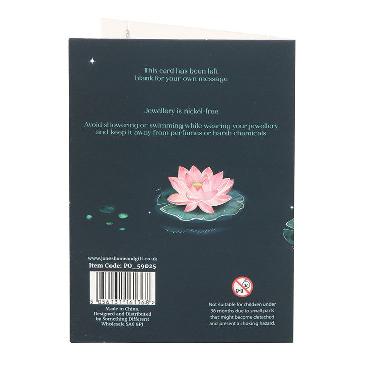 This graceful dragonfly necklace comes nestled on a matching greeting card, making it the perfect gift to celebrate resilience and personal growth. Includes a silver-tone stainless steel dragonfly pendant on a dainty nickel-free chain. Includes an envelope with a serene pond-inspired design of frogs, dragonflies, lily pads and koi fish. Card left blank inside.