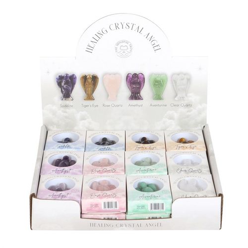 These healing crystal angels are a thoughtful token gift for someone special. There are six different types of healing crystals shaped as angels; Sodalite, Tiger's Eye, Rose Quartz, Amethyst, Aventurine and Clear Quartz. Presented in a matching countertop display with 24 pieces and 4 of each design.